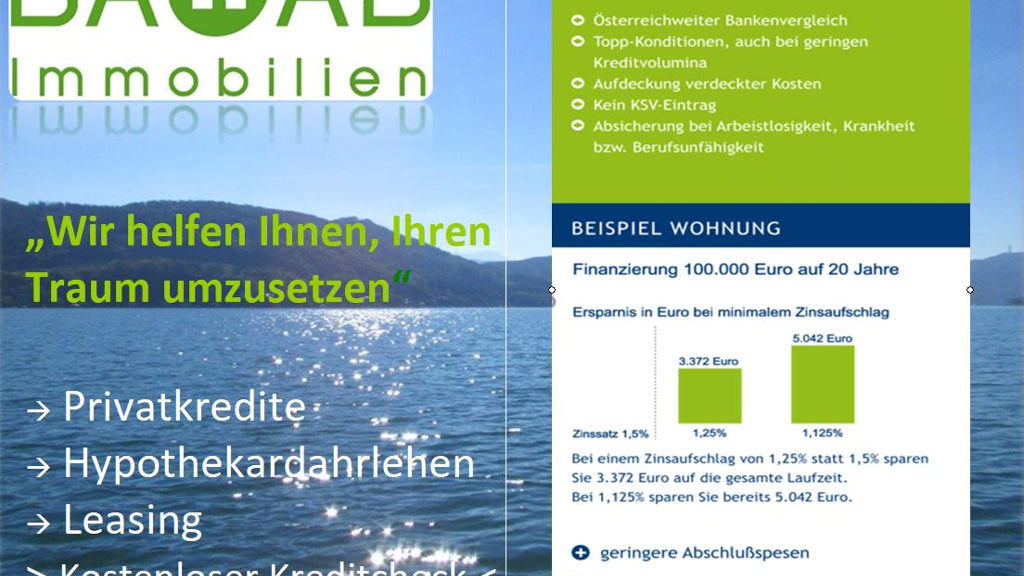 Gerne stehen wir Ihnen für Fragen bzw. einen unverbindlichen Besichtigungstermin zur Verfügung (+43 463 51 51 61). Weitere Bilder bzw. Liegenschaften finden Sie auf unsere Homepage unter www.baoab.at . Die angegebenen Daten stammen vom Eigentümer/Eigentümervertreter/Verwalter. Sie sind gewissenhaft erhoben worden. Dennoch kann für die Richtigkeit und Vollständigkeit keine Haftung übernommen werden. Zahlenangaben können gegebenenfalls gerundet sein oder auf Schätzungen beruhen. Irrtümer und Änderungen vorbehalten. Das Angebot ist freibleibend und unverbindlich.