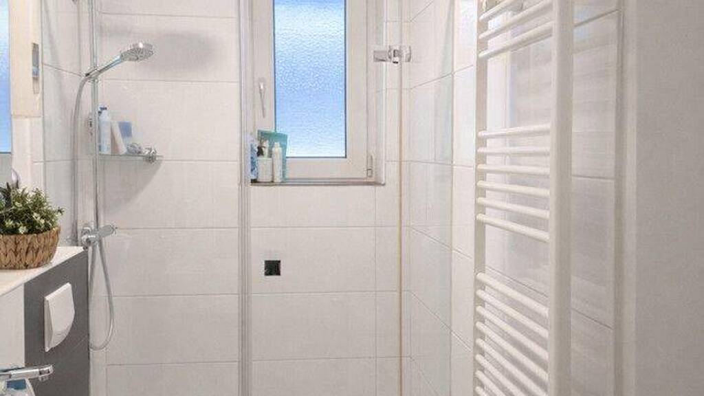 Das moderne Duschbad mit Fenster sorgt für angenehme Tagesbelichtung und zeitgemäßen Komfort.
