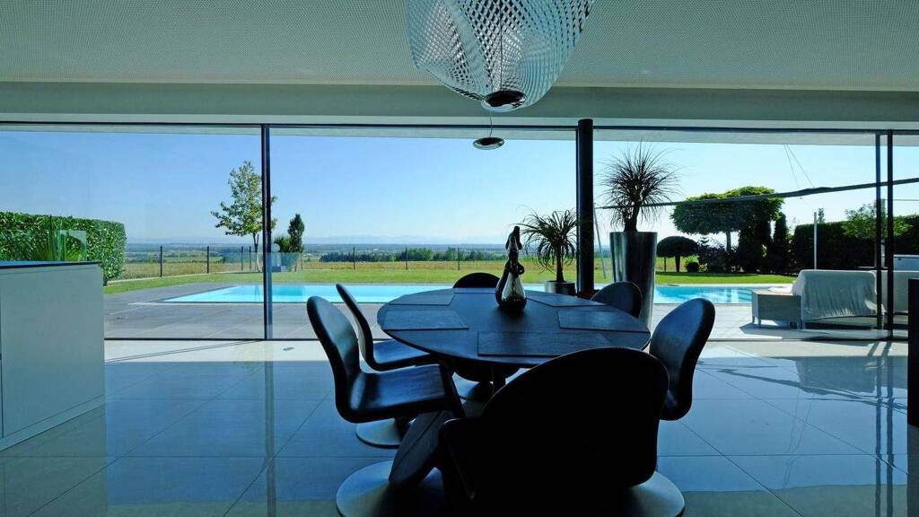 Einmal eingetreten, kann man bereits erahnen, welchen Luxus dieses Domizil zu bieten hat. Durch die große Glastüre erhascht man hier bereits den Blick ins Interieur und in den Garten.
