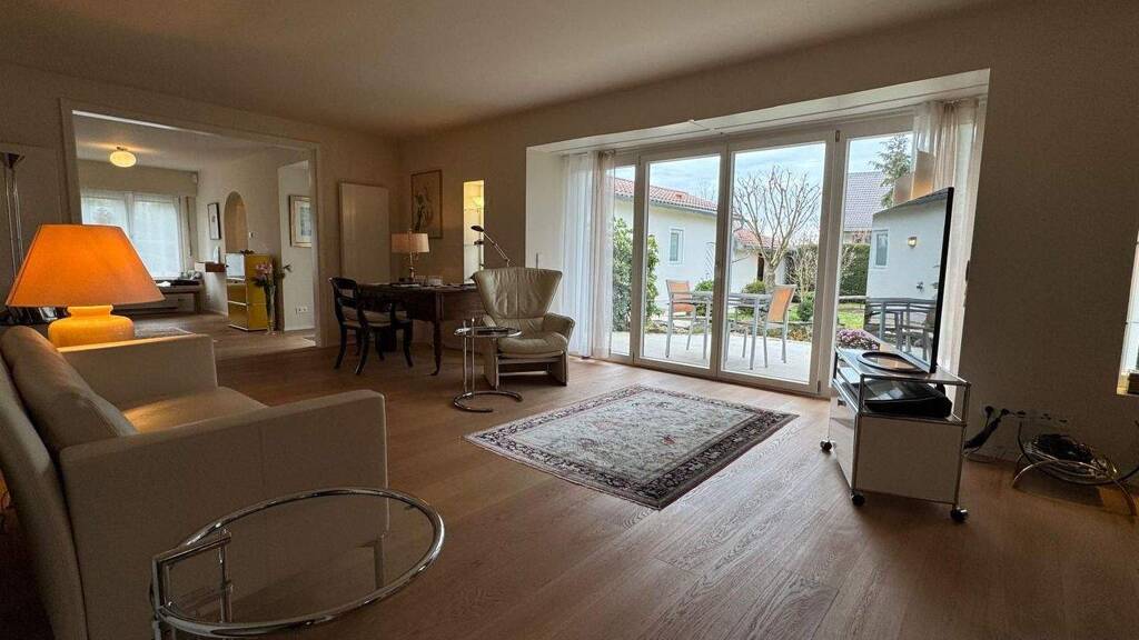 Großzügig geschnittene, hochwertig ausgestattete Wohnung mit repräsentativem Charakter. Der im Anbau liegende Schlafbereich verfügt über einen weiteren Zugang. Die Räume überzeugen durch Großzügigkeit, Helligkeit und eine gehobene Ausstattung. Ideal für anspruchsvolles und barrierefreies Wohnen auf einer Ebene.