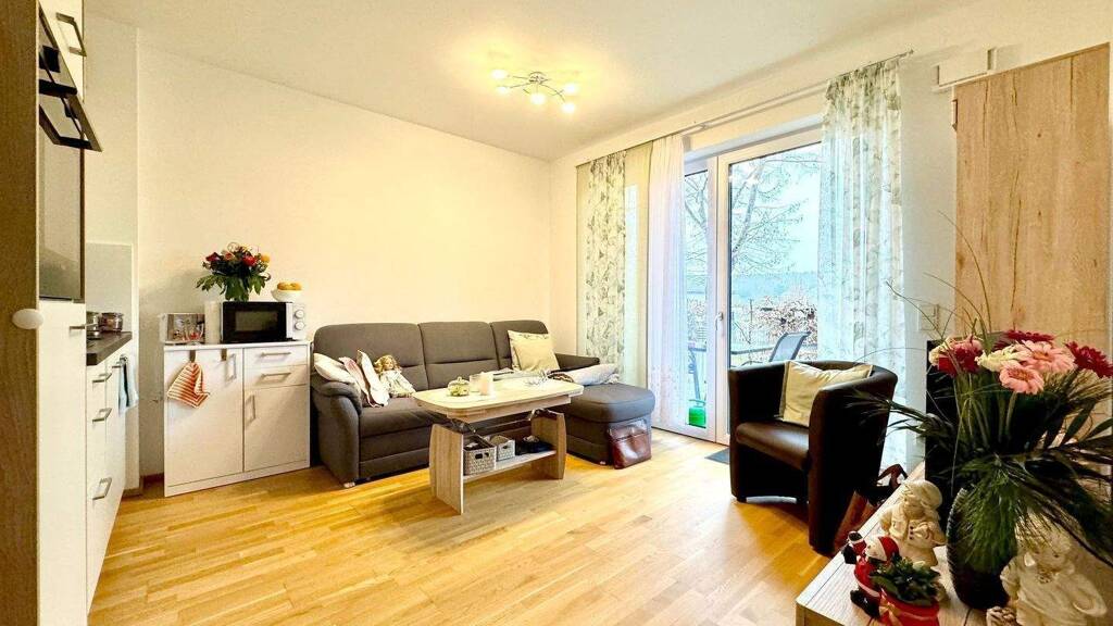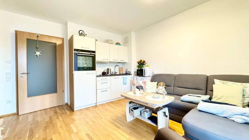 Das Wohnzimmer ist nach Osten ausgerichtet und ist großzügig geschnitten. Durch die große Fenster-front ist das Zimmer ganztags gut belichtet und lässt sich schön einrichten. Im Wohnbereich ist der Kochbereich mit integriert und wurde mit einer praktischen Einbauküche ausgestattet.