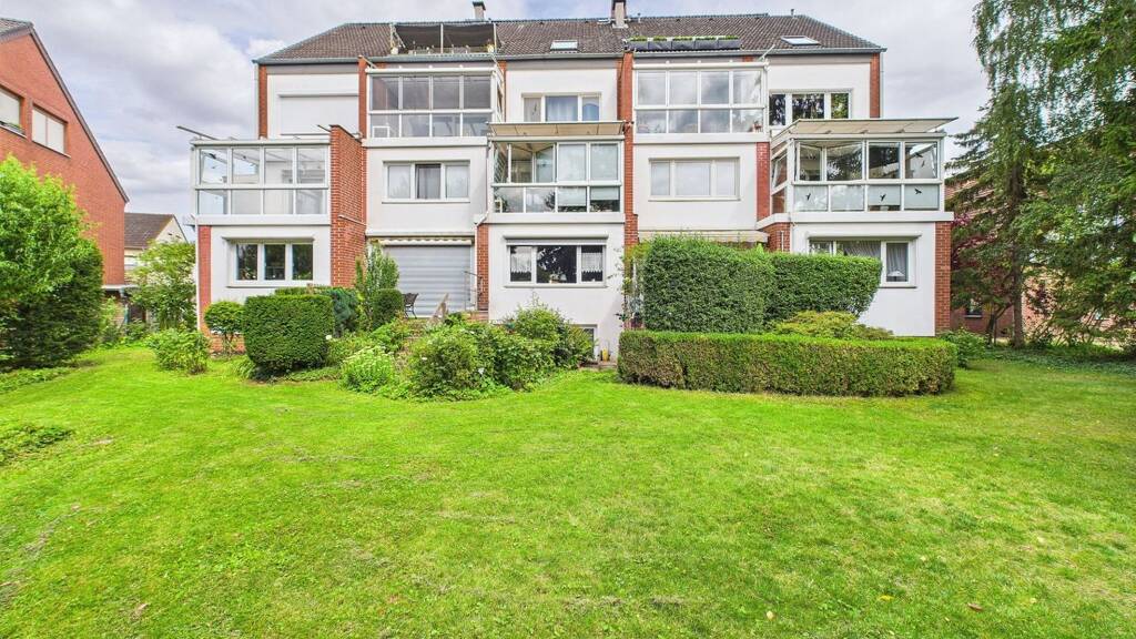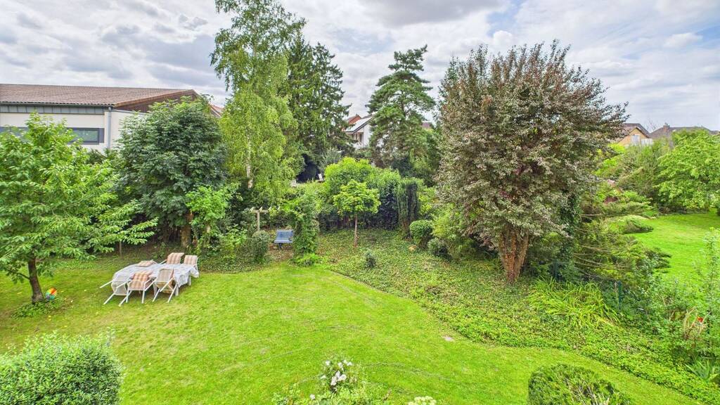 Ein besonderes Highlight der Immobilie ist der weitläufige Gemeinschaftsgarten, der viel Platz für Entspannung und Freizeit im Freien bietet. Ein gemütlicher Sitzbereich mit Tisch lädt zu Mahlzeiten im Grünen ein, während eine lauschige Holzbank unter einem grünen Bogen zum Verweilen und Erholen einlädt. Der Garten ist von hohen Bäumen und gepflegten Hecken umgeben, die für Privatsphäre und eine angenehme Atmosphäre sorgen.