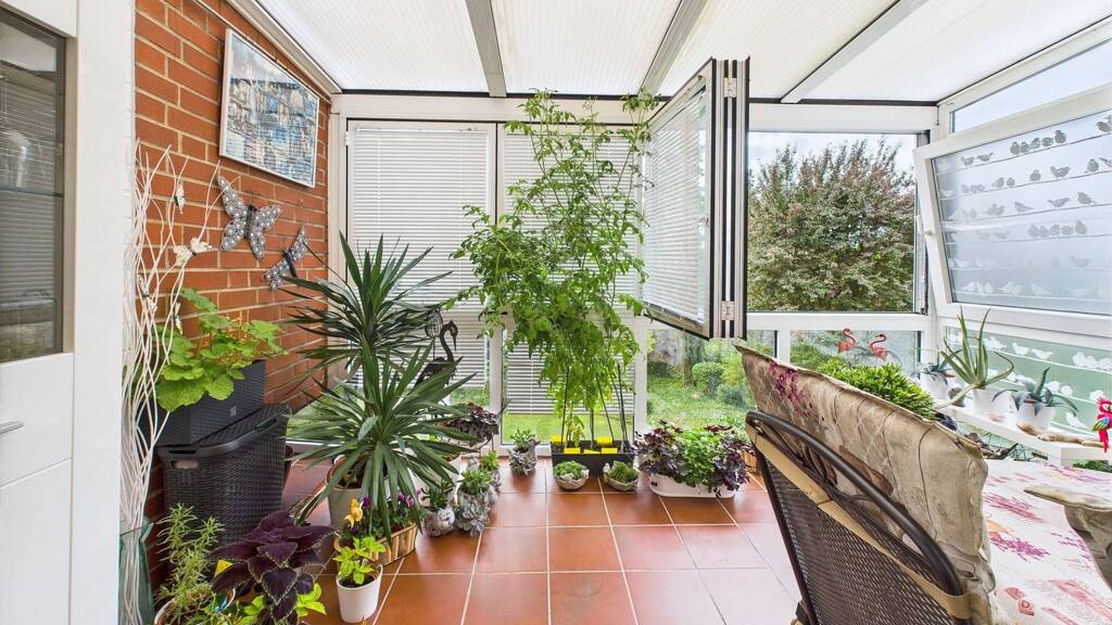 Die Wohnung empfängt Sie mit einem geräumigen Wohnzimmer, das durch seine großen Fensterflächen und den direkten Zugang zum Wintergarten lichtdurchflutet ist. Der gute Grundriss bietet vielfältige Gestaltungsmöglichkeiten. Vom Wohnzimmer aus gelangen Sie in den hellen Wintergarten, der sich perfekt als Essbereich oder als grüne Oase eignet. Hier genießen Sie entspannte Stunden mit Blick in den wunderschön angelegten Gemeinschaftsgarten. Die Fliesen in Terrakotta-Optik und die Ziegelwand verleihen diesem Raum ein mediterranes Flair.