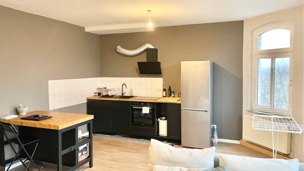 Die Küche ist offen und im Wohnzimmer integriert, die bestehende Einbauküche können Sie optional und nach Absprache vom Vormieter übernehmen.