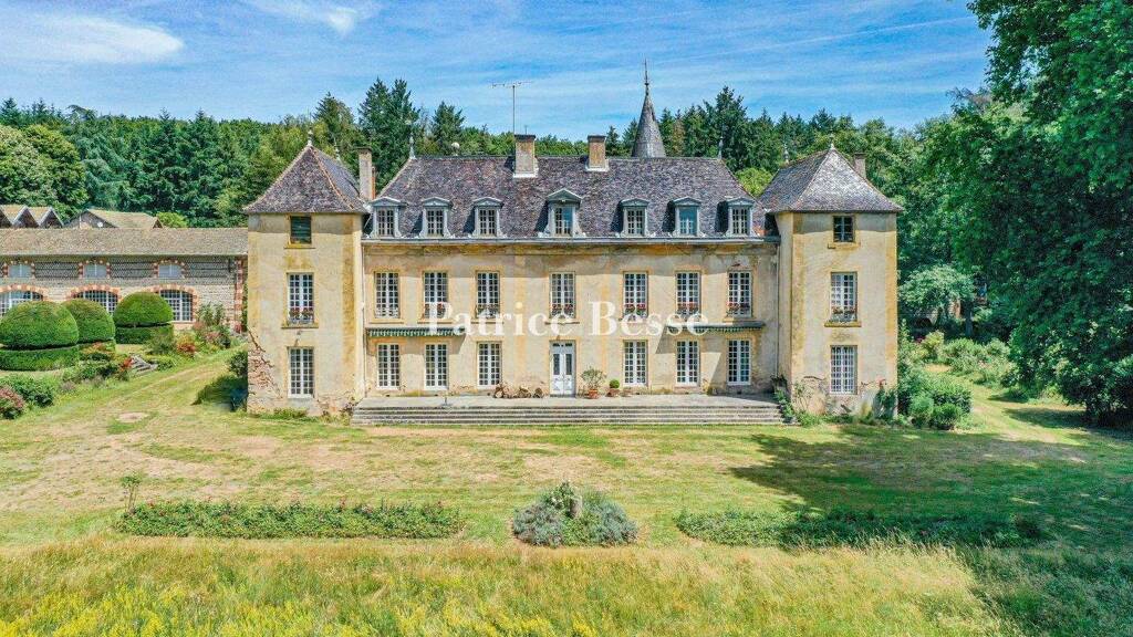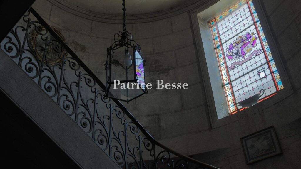 The chateau is entered via a vast vestibule, with terrazzo flooring and a black marble fireplace, which leads to the two wings set at right angles. In the central building, a corridor opens on to the south-facing, stone terrace and the parklands. It leads to the reception rooms: a dining room and a lounge, spanning approx. 50 m² each, on the south side, a library and a study on the west side. Most of these rooms boast herringbone pattern parquet flooring, wainscoting, French ceilings, marble fireplaces and wrought casement bolts on the windows. The presence of an impressive marble fountain used as hand-washbasin is worthy of note in the dining room. The eastern section is given over to utility rooms: a bedroom, with an en suite bathroom, a functional kitchen and a scullery. The two wings set at right angles on the courtyard side have separate entrances and house two vast, bright rooms, one of which has a marble fireplace; some windows are enhanced with stained glass. Both towers house stairways: one is the main one and the other is for staff use. The remarkably fluid, main stairway, made of stone with a wrought iron balustrade, climbs up to the first floor. The stairwell is illuminated via a stained-glass window and decorated with painted rendering. The second stairway climbs up to the attic space and the staff bedrooms.