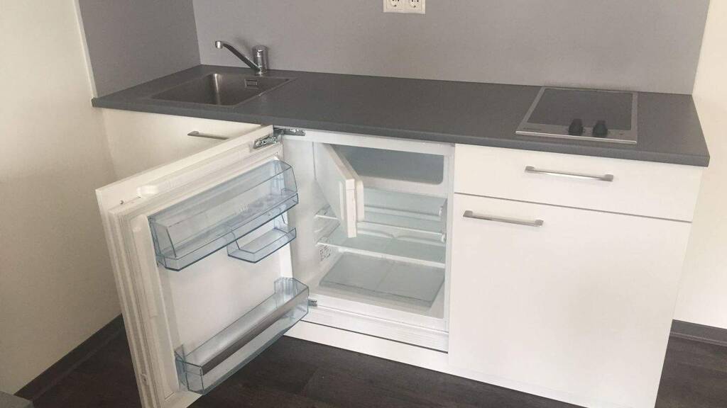 - Singleküche mit 2-Platten-Herd, Mikrowelle mit Grillfunktion, Kühlschrank mit Gefrierfach, Spüle, Regal und Unterschränken