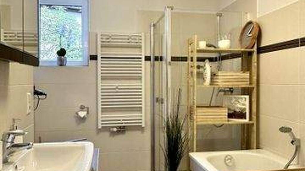 Das Badezimmer verfügt über eine bodentiefe Dusche und eine Badewanne. Der Waschtrockner befindet sich in einer separaten Abstellkammer.