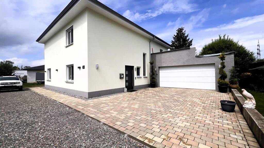 Das neuwertige Einfamilienhaus wurde 2019 auf einem großzügigen Grundstück von ca. 1.246 m² in Massivbauweise errichtet und bietet mit einer Wohnfläche von rund 213 m² ein komfortables und modernes Wohnerlebnis. Die Immobilie befindet sich in einem äußert gepflegten Zustand, modernisiert zuletzt im Jahr 2023, und vereint eine gehobene Ausstattungsqualität mit praktischen Grundrisslösungen für ein entspanntes Familienleben. Beim Betreten des Hauses empfängt Sie ein einladender Eingangsbereich, gefolgt von einem offen gestalteten Wohn- und Essbereich. Dieser bietet durch seine Größe vielfältige Möglichkeiten zur individuellen Möblierung und wird von großen Fensterflächen mit Tageslicht durchflutet. Im Zentrum des Wohnbereichs lädt ein Kaminofen zu gemütlichen Abenden ein und sorgt zusammen mit der effizienten Ofenheizung und Fußbodenheizung an kälteren Tagen für angenehme Temperaturen. Die angrenzende Küche überzeugt mit einer modernen Einbauküche, Kochinsel und Arbeitsflächen aus Naturstein. Angrenzend finden Sie eine praktische Speisekammer. Damit stehen Ihnen optimale Voraussetzungen für geselliges Kochen und gemeinsames Essen zur Verfügung. Das Raumangebot umfasst fünf flexibel nutzbare Schlafzimmer, wovon sich eines auch hervorragend als Arbeitszimmer eignet. Ein separates Ankleidezimmer schafft zusätzlichen Komfort im Alltag. Das Badezimmer ist luxuriös gestaltet und bietet eine hochwertige Sanitärausstattung. Die Nutzung des Hauses gestaltet sich zudem durch den durchdachten Grundriss und die hochwertige Haustechnik sehr komfortabel und energetisch. Mehrere Außenstellplätze sowie eine Doppelgarage mit direktem Zugang zum Haus sorgen für praktische und sichere Parkmöglichkeiten.