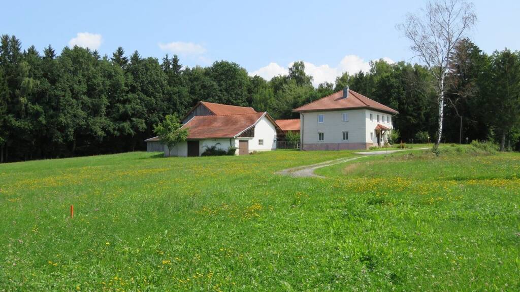 Grundstück Das arrondierte, fast ebene, nach Südwesten ausgerichtete Grundstück hat insgesamt eine Größe von ca. 41.596 m², liegt direkt am Anwesen und wird größtenteils als Wiese genutzt. Direkter Blick vom Haus auf die gesamte Fläche. Obstbäume, z. B. Zwetschgen- und Pfirsichbaum. Traubenstock. Kleiner Mischwaldbestand, überwiegend Laubbäume. Pflanzbeete. Ziersträucher. Wassergraben im unteren Bereich des Grundstücks. 2 gute, geschotterte, öffentliche Zufahrten. Hofraum. Ca. 8 Meter tiefer Brunnen mit Handpumpe im Hofraum.
