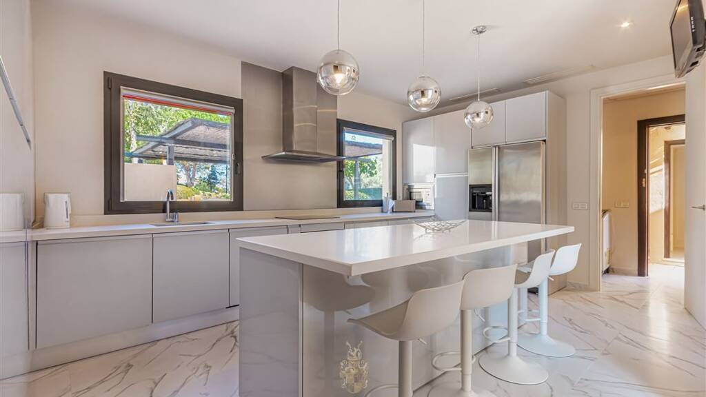 Die Villa verfügt über zahlreiche erstklassige Ausstattungsmerkmale, darunter eine Klimaanlage, einen Hauswirtschaftsraum, einen Kamin und Marmorböden. Die voll ausgestattete Küche bietet alle notwendigen Geräte und ist ideal für die Zubereitung von Mahlzeiten. Von der Villa aus genießen Sie einen atemberaubenden Blick auf das Meer und den Golfplatz.