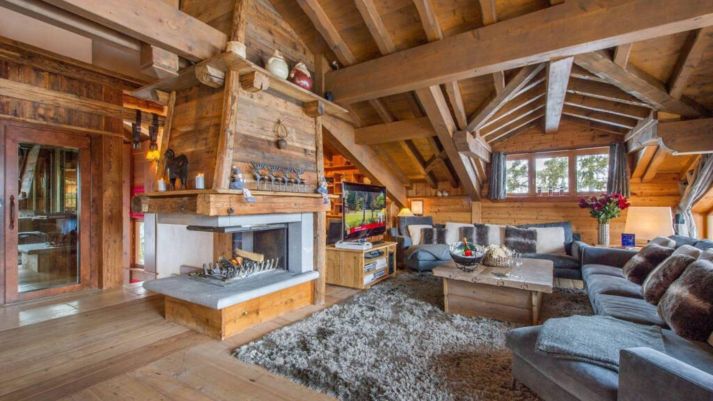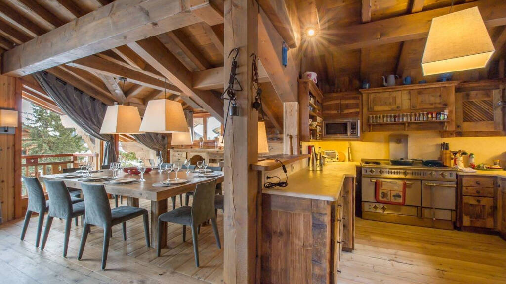 Spanning nearly 300 m2 across four levels, the chalet harmoniously combines luxury, authenticity and conviviality. The decor, true to the purest Savoyard spirit, showcases omnipresent reclaimed wood, dressing the interiors from floor to ceiling and reinforcing the property's warm, rustic soul. The top floor hosts a magnificent, light-filled living area featuring an open-plan kitchen, a welcoming dining room and an elegant lounge enhanced by a central fireplace - the true heart of the chalet.