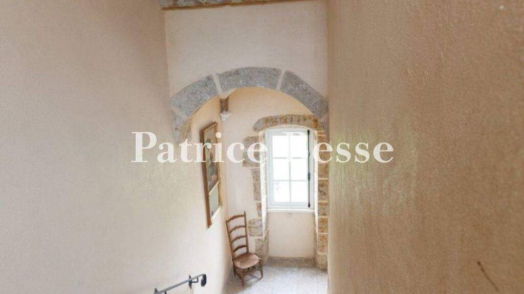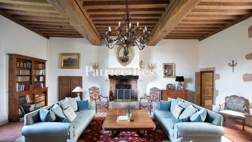 The arched front door stands beneath a remarkable oval fanlight. The door leads into a hallway where a broad U-shaped stone staircase leads upstairs. The ceilings are vaulted and the floor is covered with slabs of Burgundy stone. The hallway connects to a large lounge on one side and to a dining room on the other. These rooms have floors of terracotta tiles and clay bricks. Remarkable fireplaces from the 17th century - one of limestone and one of brick - stand beneath French-style beamed ceilings of raw timber. The double-glazed windows are fitted with indoor shutters that close within large recesses. The kitchen has a floor of terracotta tiles. It lies beside the dining room. In the adjoining square towers, there is an office and a utility room. Tall rectangular small-paned windows with fanlights bathe the interior in natural light.