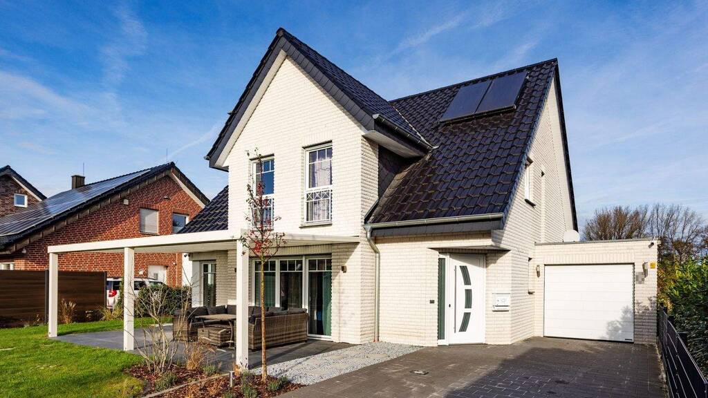 Der elegante weiße Klinker, die klaren Linien sowie die hochwertigen, hellen Bodenbeläge verleihen dem Haus einen modernen und zeitlosen Charakter. Großzügige, bodentiefe Fenster im Wohnbereich und in der weißen Einbauküche lassen viel Tageslicht in die Räume und schaffen ein freundliches, offenes Ambiente. Das Herzstück des Hauses bildet der lichtdurchflutete Wohn- und Essbereich. Hier finden sowohl Ihre neue Wohnlandschaft als auch der große Esstisch für die ganze Familie mühelos Platz. Ein hochwertiger Holzkamin sorgt an Wintertagen für angenehme Wohnatmosphäre. Das Dachgeschoss überzeugt mit drei gut geschnittenen Schlafzimmern, einem großzügigen Familienbad und einem praktischen Hauswirtschaftsraum, die gemeinsam ein komfortables und alltagsgerechtes Raumangebot für Familien schaffen.
