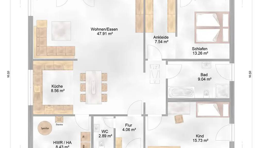 Ein gut geschnittenes Kinderzimmer bietet Platz für die jüngsten Familienmitglieder, Gäste oder auch als Homeoffice. Das Schlafzimmer beeindruckt mit einer integrierten Ankleide, die zusätzlichen Stauraum und Komfort bietet. Abgerundet wird das Raumangebot durch ein modernes Gäste-WC sowie praktische Nebenflächen wie Hauswirtschafts- oder Technikräume.