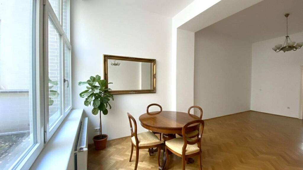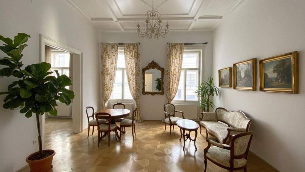 Ein besonderes architektonisches Merkmal ist die originale Holzdecke. Vereinbaren Sie noch heute einen Besichtigungstermin und sichern Sie sich Ihr Traumdomizil in einer der begehrtesten Gegenden Wiens! Es handelt sich hier teilweise um maßstabsgetreue Fotos, welche mit KI bearbeitet wurden. So oder ähnlich könnte der Raum nach erfolgter Renovierung und mit neuer Ausstattung aussehen.