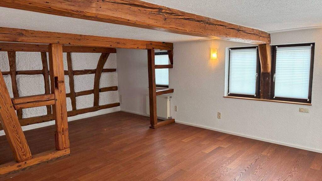 Über die Treppe gelangen Sie ins Obergeschoss, das mit seinen großzügigen ca. 75 m² Wohnfläche die ideale Kombination aus Privatsphäre und Geselligkeit bietet. Ein offener Wohn-Ess-Koch-Bereich, mit einem Kachelofen als Mittelpunkt, schafft Platz für große Tafeln, Familienfeiern oder gesellige Abende. Das Schlafzimmer überzeugt mit einer angenehmen Größe und einem angrenzenden Ankleidezimmer ein Detail, das besonders in einem Fachwerkhaus für zusätzlichen Komfort sorgt. Ein Tageslicht-Bad mit WC rundet diese Etage gelungen ab. Die Decken mit den sichtbaren Balken erinnern an die Ursprünge des Hauses und verleihen jedem Raum eine warme, wohnliche Atmosphäre.
