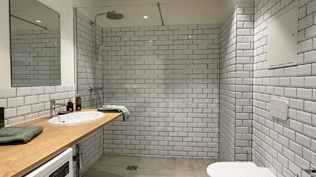 - großformatiges Feinsteinzeug und Metrofliesen in den Sanitärräumen