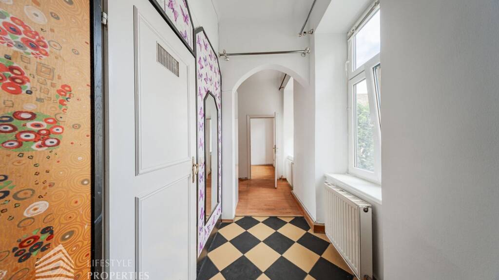 Die im 2. Stock eines traditionellen, 1900 erbauten Altbaus gelegene Wohnung verfügt über ca. 84 m² Wohnfläche und teilt sich auf in ein Wohnzimmer, eine Küche, zwei Schlafzimmer, ein Kabinett, einen Vorraum, ein Badezimmer und eine Toilette. Die Wohnung ist mit Parkett und Fliesen ausgelegt. Beheizt wird die Wohnung mittels Gasetagenheizung.