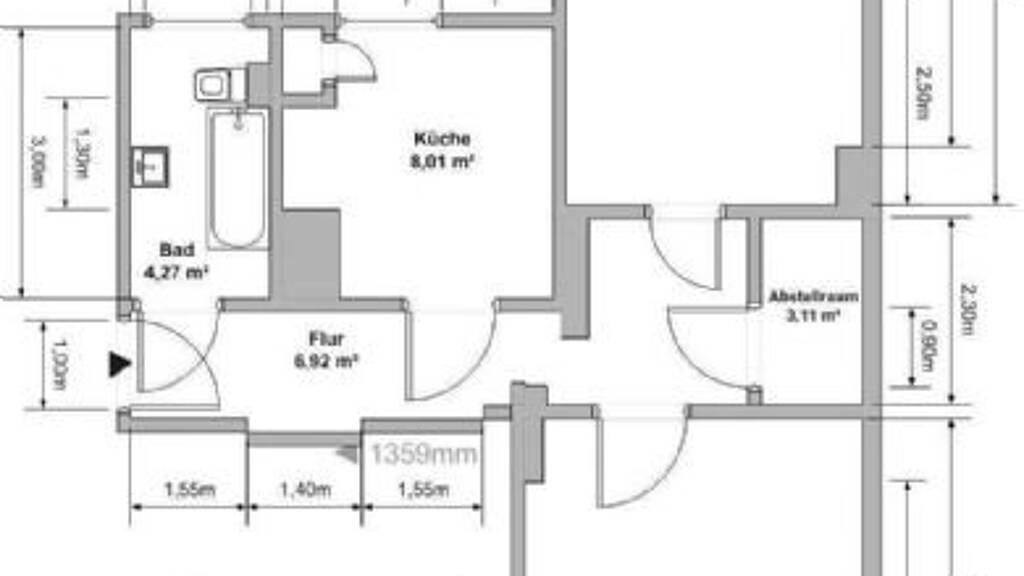 Wohnzimmer: 17,73 m² Schlafzimmer: 16,20 m² Flur: 6,92 m² Küche: 8,01 m² Bad mit WC: 4,27 m² Abstellraum: 3,11 m² Gesamt: 56,24 m²