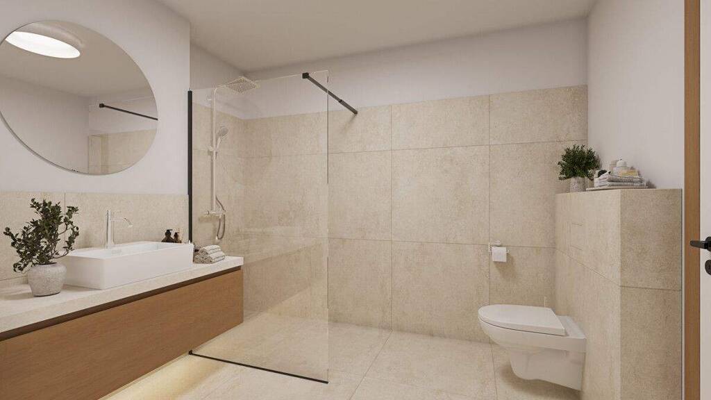 Der Eingangsbereich heißt Bewohner und Gäste willkommen und schafft einen funktionalen Auftakt. Ein praktischer Abstellraum bietet zusätzlichen Stauraum. Das Bad überzeugt durch eine stilvolle Gestaltung.
