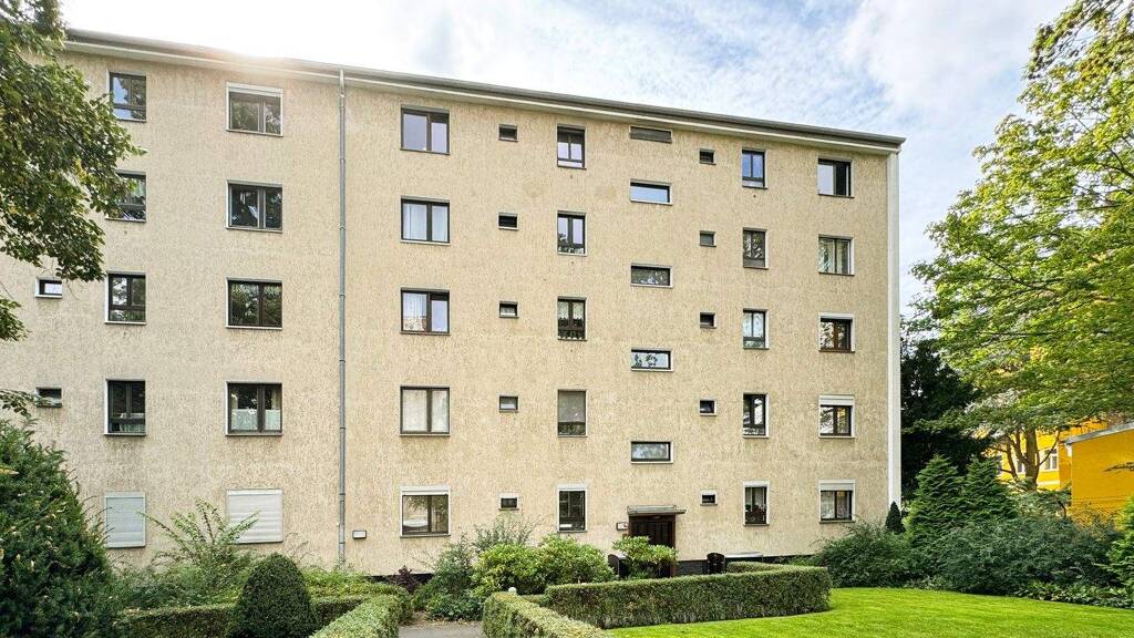 Die angebotene Wohnung liegt im 2. Obergeschoss eines viergeschossigen, 1955 erbauten Wohnhauses. Sie verfügt über zwei Zimmer, von denen das größere mit vorgelagerter Loggia nach Süden zum begrünten Grundstück ausgerichtet ist.