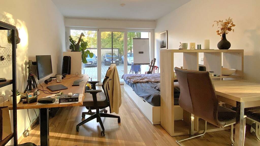 Der kombinierte Wohn- und Schlafbereich ist funktional geschnitten und bietet Platz für das tägliche Leben auf kleinem Raum. Eine moderne Einbauküche ist bereits im Kaufpreis enthalten und ermöglicht eine sofortige Nutzung ohne zusätzlichen Aufwand. Die angrenzende Terrasse erweitert den Wohnraum ins Freie und bietet Platz für einen kleinen Sitzbereich.