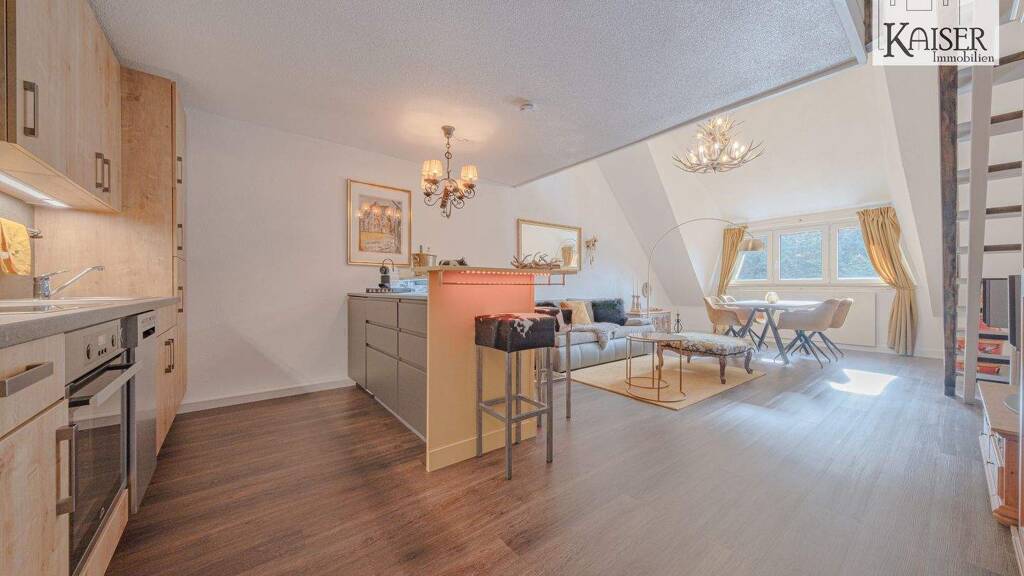 Die Wohnung erstreckt sich über zwei Ebenen und bietet eine freundliche, offene Atmosphäre mit hellen Räumen und weitläufigem Ausblick. Das große Gaubenfenster bringt reichlich Tageslicht an den Essplatz und in den Wohnbereich - ein idealer Ort zum Entspannen.