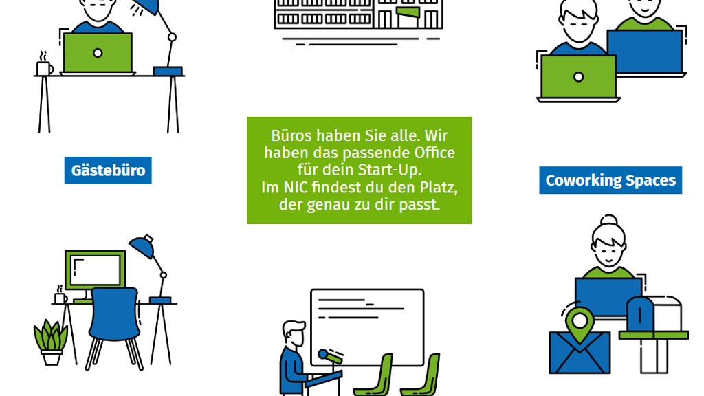 Egal wie groß oder klein dein Unternehmen ist, egal ob du nur kurzfristig einen Veranstaltungsraum brauchst oder längerfristig ein Büro oder andere Geschäftsflächen suchst, egal ob für dich alleine oder für mehrere Mitarbeitende, ob du Coworking möchtest oder ein Gästebüro – das NIC bietet dir die passenden Möglichkeiten. Das NIC unterstützt Existenzgründer und junge Unternehmen, damit du dich voll und ganz auf dein Business konzentrieren kannst.