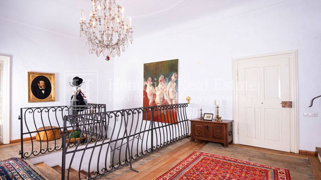 Eine imposante Stiege mit historischem Eisengeländer führt in die Beletage. Hier finden sich 5 große Räume, 2 Bäder und eine weitere Küche. Vom Zentralsalon aus gelangt man auf den barocken, geschwungenen Balkon, der den Haupteingang akzentuiert.