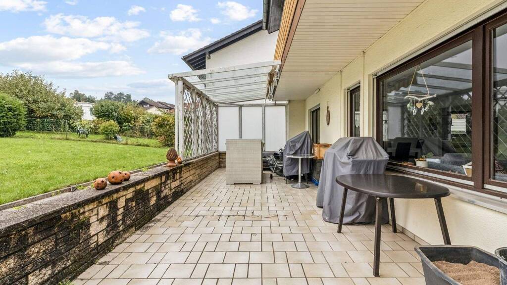 Der großzügige Wohn- und Essbereich wird durch einen gemütlichen Kachelofen ergänzt und bietet Zugang zur überdachten Terrasse mit Glasdach und Markise. Eine Einbauküche ist vorhanden. Zum Haus gehören außerdem ein Balkon, ein Vorratskeller, ein Technikraum, eine Werkstatt sowie ein nicht in der Wohnfläche berücksichtigter Hobbyraum.