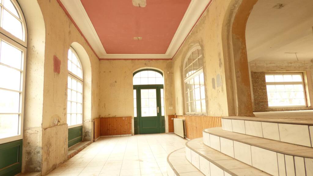 Der ebenerdig gelegene, kleinere Raum der Gewerbeeinheit ist über eine innen liegende Freitreppe mit dem Hauptraum im Hochparterre verbunden. Insgesamt bestehen zwei Zugangsmöglichkeiten vom Marktplatz aus. Im Objekt befinden sich die Gewerberäume im EG und Hochparterre sowie ein direkter Kellerzugang von den Gewerbeinneren. Ausstattung: Die Medien wie Trink- und Schmutzwasseranschluss, Elektro sind vorhanden, aber entsprechend den heutigen Standard nicht. Zur Beheizung ist die Installation einer Gas-Etagenheizung vorgesehen. Der Einbau kann in Eigenregie vorgenommen werden, um die Mietbelastung geringer zu halten.