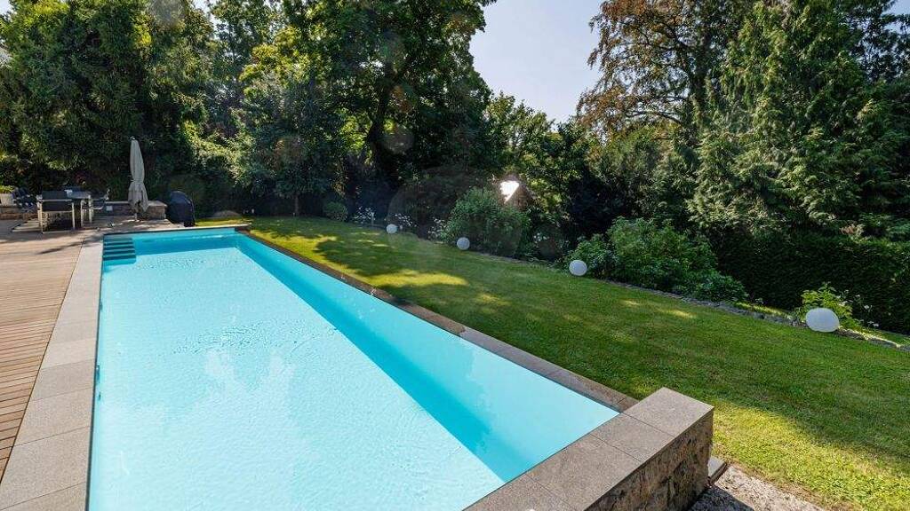 Diese exklusive Villa in der begehrtesten Lage des Bad Homburger Hardtwalds, in unmittelbarer Nähe zum Kurpark, ist das perfekte Zuhause für Familien. Die lichtdurchfluteten Räume, die durchdachte Raumaufteilung und die Verwendung hochwertiger Materialien schaffen eine elegante und einladende Atmosphäre im gesamten Haus. Der helle Eingangsbereich führt direkt in das Wohnzimmer mit Kamin sowie in die großzügige, moderne Poggenpohl-Küche mit Siemens- und Gaggenau-Geräten. Besonders beeindruckend ist das lichtdurchflutete Esszimmer mit einer Deckenhöhe von über 5 Metern. Bodentiefe Fenster öffnen den Raum zur imposanten Süd-Terrasse mit einem geschmackvoll angelegten, eingewachsenen Garten und einem beheizten Außenpool. Ein Gäste-WC, ein Abstellraum, ein Zugang zur Garage und ein Arbeitszimmer komplettieren das Erdgeschoss. Im Obergeschoss erwartet Sie der Master-Bedroom mit begehbarem Kleiderschrank und einem großzügigen En-Suite-Bad. Zwei gemütliche Kinderzimmer mit eigenem Bad und separatem WC runden diese Etage perfekt ab. Das ausgebaute Dachgeschoss, das nicht in der Wohnfläche enthalten ist, bietet zwei weitere Zimmer und ein Duschbad. Von hier aus genießen Sie einen atemberaubenden Ausblick über den Kurpark bis hin zum Taunus. Im Untergeschoss befinden sich neben den Technik- und Abstellräumen ein luxuriöser Wellnessbereich mit Sauna, Whirlpool und Fitnessraum. Zudem ist hier eine helle und großzügige Einliegerwohnung mit zwei Zimmern, eigenem Bad und Küchenanschluss, die sowohl vom Untergeschoss als auch über einen separaten Eingang erreichbar ist. Die Einliegerwohnung kann auch als zweites Schlafzimmer genutzt werden. Die Villa verfügt außerdem über eine Doppelgarage und einen hochwertig gestalteten Garten mit herrlichem Blick über den Kurpark, der das Gesamtbild dieses exklusiven Anwesens harmonisch abrundet.