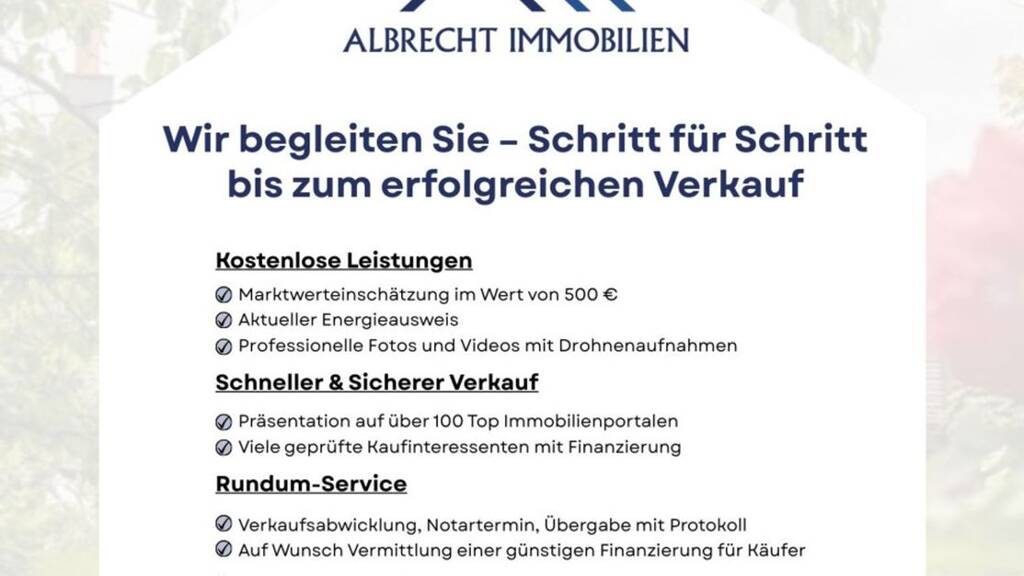 Wir freuen uns auf eine gemeinsame Besichtigung mit Ihnen. Alle Angaben beruhen auf Verkäuferseite. Albrecht Immobilien übernimmt keine Haftung für die Richtigkeit und Vollständigkeit der Angaben. Gerne vermitteln wir Ihnen auch eine günstige Finanzierung.