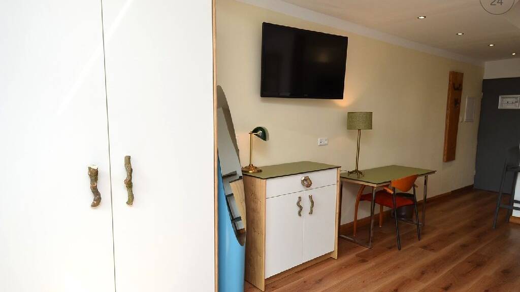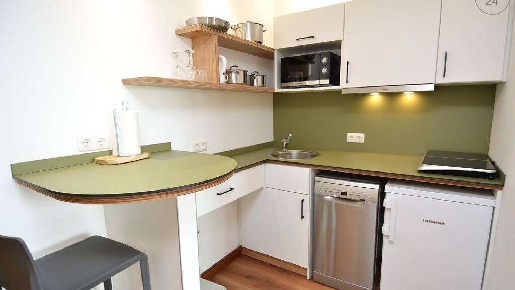 Das Apartment ist neu möbliert und stilvoll ausgestattet, bietet einen Schlafbereich mit Einzelbett, ein Duschbad und eine integrierte, offene Pantryküche.