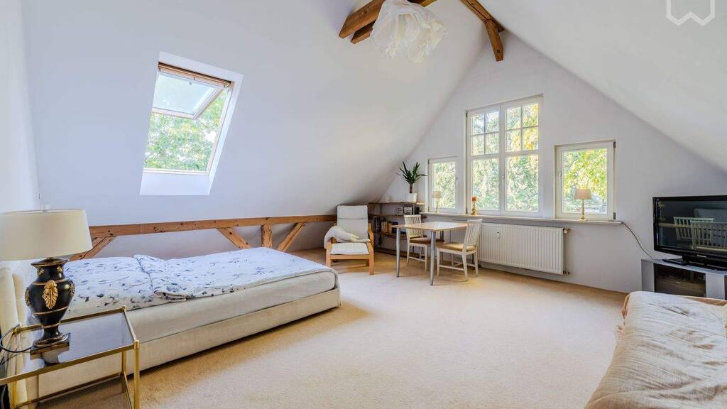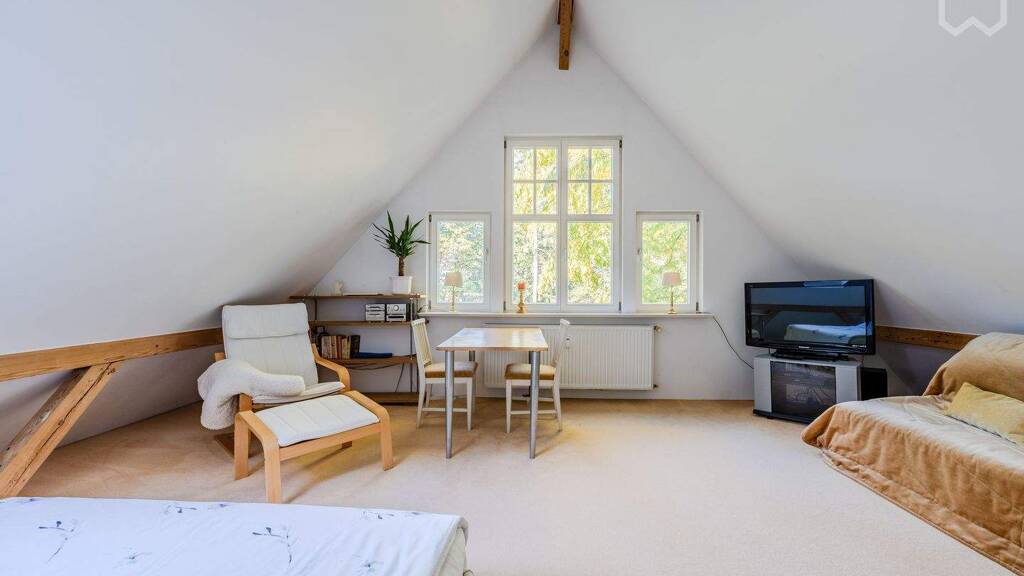 Das idyllische DG-Loft liegt im 2. Stock einer zauberhaften Familienvilla im Grünen. Das Apartment bietet allen modernen Komfort. Die offene Küche ist komplett ausgestattet mit Kühlschrank, Spülmaschine, Induktionskochfeld Kochtöpfen und Geschirr. Das Bad besteht aus einer offenen Regendusche. Parkplätze gibt es vor der Tür ausreichend. Der Blick in den Garten, die Ruhe und Natur werden besonders geschätzt. Die fußnahen S-Bahn-Linien S1 und S7 bieten Tag und Nacht hervorragende Verkehrsverbindungen in die City Ost u West (20 min), nach Potsdam und an alle Öffentlichen Verkehrsmittel. Mit dem Auto fährt man die Avus bis zur Abfahrt Spanische Allee - von da aus sind es noch ca. 2 Minuten. Der Bäcker, eine Einkaufsmöglichkeit und schöne Restaurants sind fußläufig gut zu erreichen. Der nächste Bio-, und Aldi-Markt ist am Schlachtensee (1 S-BahnStation entfernt), in dem man gut baden kann - mit Biergarten, StandUpPaddling und Ruderbootverleih. Der Markt am Mexikoplatz ist Samstags ein beliebtes Plätzchen.