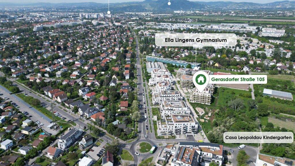 Das Projekt grenzt nördlich an ein idyllisches Wald- und Wiesengebiet und südlich an die Gerasdorfer Straße. Auf Grund der Lage des Gebäudes in zweiter Reihe ist ein ruhiges Wohnambiente garantiert. Durch die vorhandene Infrastruktur und Nahversorgung eignen sich die Wohnungen sowohl für Familien als auch für Singles. Der Marchfeldkanal ist fussläufig in ca. 10 Minuten und die U-Bahn-Linie U1 - Leopoldau mit dem Bus in ca. 15 Minuten zu erreichen.