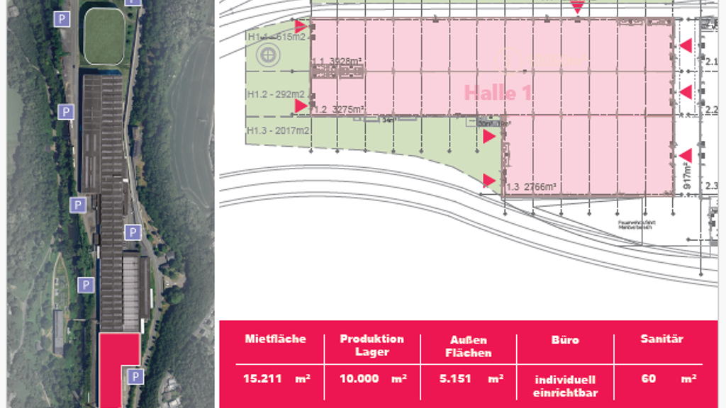 Lager/Produktion: ca. 10.000m² Außenfläche: ca. 5.151m² Sanitärflächen: ca. 60m² Büroflächen: nach Absprache verfügbar Verfügbarkeit: nach Vereinbarung