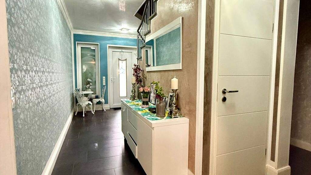 Bereits beim Betreten des Eingangsbereichs fallen die großformatigen, modernen Fliesen sowie der Treppenaufgang im Marmor aus. Die Küche mit dem angrenzenden Hauswirtschaftsraum bietet Platz für gemeinsames Kochen und anschließenden gemütlichen Beisammensein im großzügigen Wohn- und Esszimmerbereich. Die zwei Schlafzimmer (Design Vinyl) im Erdgeschoss sowie das Badezimmer mit Dusche, Badewanne und Fußbodenheizung ermöglichen barrierefreies Wohnen. Die Große Garage ist komplett verfliest und verfügt über ein angrenzendes WC.