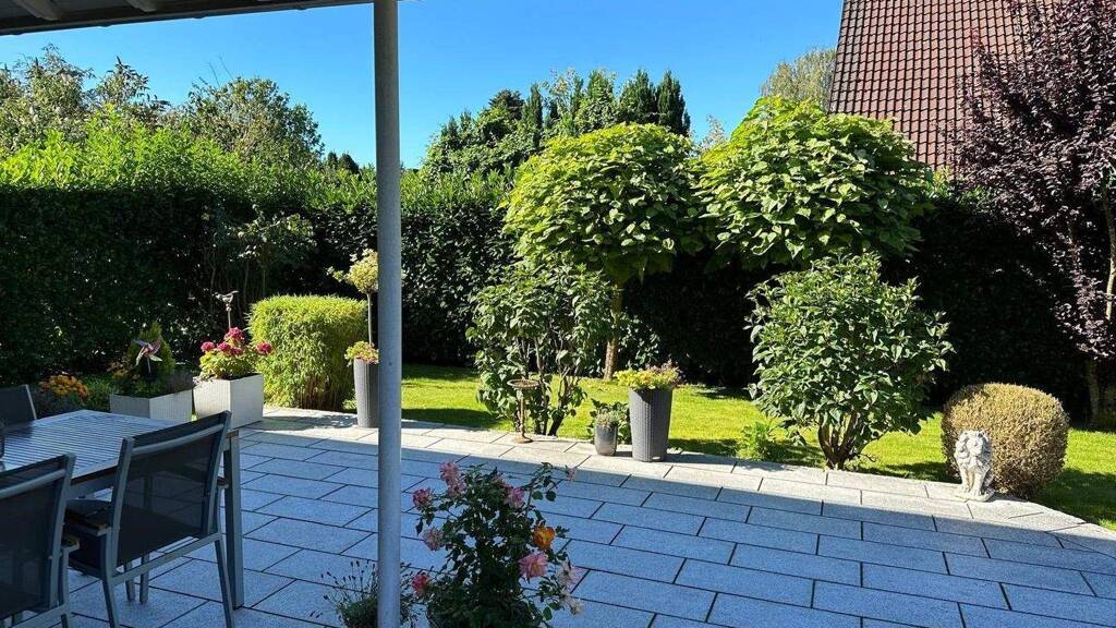 Hier erwartet Sie eine attraktive, halbüberdachte Eckterrasse aus Granitstein - ein uneinsichtiger, geschützter Ort für entspannte Stunden zu jeder Tageszeit. Ob ruhige Momente im Grünen oder gesellige Abende mit Freunden - dieser Außenbereich bietet vielseitige Möglichkeiten.