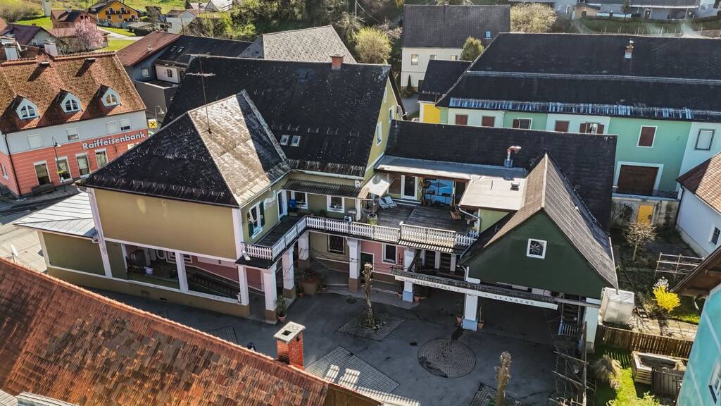 Zum Verkauf steht dieser idyllische Gasthof am Dorfplatz von Großklein, ein vielseitiges Anwesen mit einem breiten Spektrum an Nutzungsmöglichkeiten. Das Erdgeschoss beherbergt eine Gaststätte samt Disco, während sich im ersten Obergeschoss Säle, eine kleine Wohneinheit und eine großzügige, moderne Wohnung von etwa 151,8 m² befinden, die im Jahr 2007 ausgebaut wurde. Im zweiten Obergeschoss finden sich derzeit ungenutzte Zimmer sowie Zugang zu zwei Rohdachbodenflächen mit insgesamt ca. 161 m². Auf dem Grundstück befindet sich zudem ein Nebengebäude mit drei Garagen und einer etwa 60 m² großen Wohneinheit. Weiters gibt es im Innenhof ca. 10 Stellplätze.