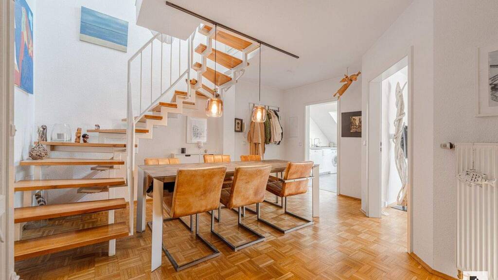 Moderne Maisonette-Wohnung in Meerbusch-Büderich mit ca. 105 m² Wohnfläche, 4,5 Zimmern, 3 Schlafzimmern, 2 Bädern und Dachterrasse. Die Aufteilung über zwei Ebenen schafft ein luftiges Wohngefühl und bietet viel Platz für Paare, Familien oder Wohnen und Arbeiten unter einem Dach. Ein Badezimmer mit Badewanne und ein weiteres mit Dusche sorgen für zusätzlichen Komfort im Alltag - ideal auch für Familien mit Kindern oder Gäste.
