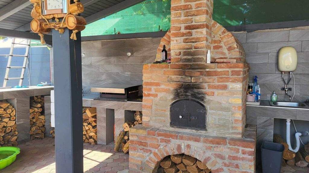 Das Haus verfügt über ein Wohnzimmer, eine Küche mit Esszimmer, vier Zimmer und ein Badezimmer. Die knapp 54 m2 große überdachte Terrasse dient auch als Sommerküche, mit eingebautem Backofen und Grillmöglichkeiten.