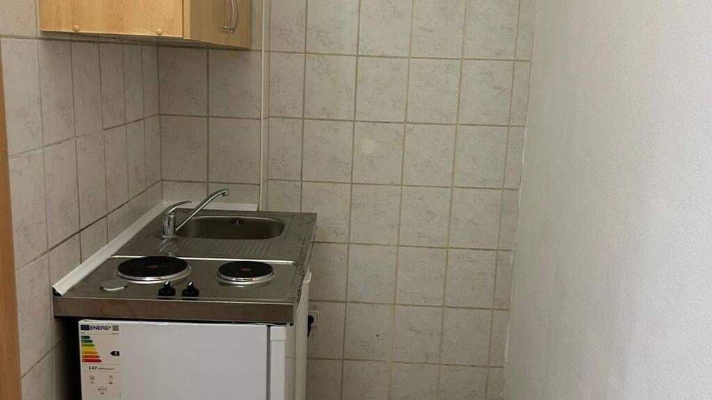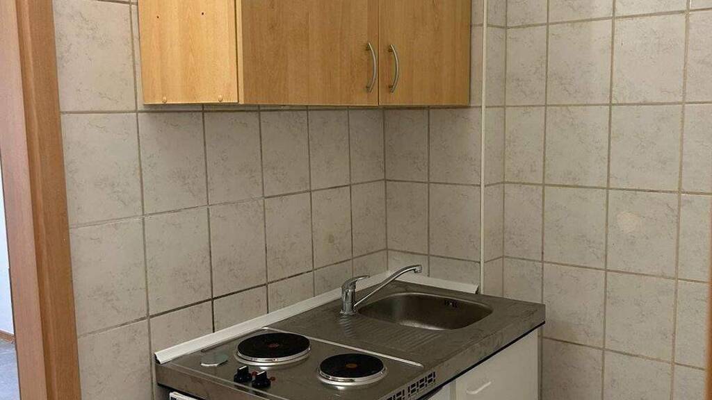 Singleküche (zwei Herdplatten, Kühlschrank, Spüle, Hängeschrank)