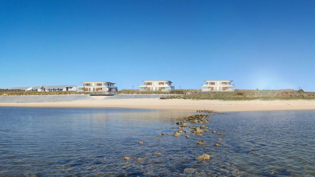 Im ersten Bauabschnitt entstehen auf einer Fläche von ungefähr 6.000 m² drei Gebäude. Jedes Gebäude bietet Platz für 14 Wohnungen, die eine Größe von 66 m² bis 152 m² haben. Darüber hinaus gibt es zwei Penthäuser mit ca. 152 m². Alle Gebäude sind nach Süden ausgerichtet. Die Wohnungen werden mit hochwertigen Materialien ausgestattet und verfügen unter anderem über eine Sauna, einen Gaskamin und eine moderne Küche. Für eine optimale Belichtung werden Holzfenster (Meranti) installiert, während die Penthäuser zusätzliche Flachdachfenster erhalten. Ein Aufzug im Treppenhaus ermöglicht den barrierefreien Zugang von der Tiefgarage zu den Wohnetagen. Die Badezimmer werden komplett eingerichtet und mit Fliesen versehen. Die Decken und Wände der Wohnungen werden gespachtelt und mit Malervlies belegt. In den Wohnräumen, Küchen und Fluren wird ein hochwertiges Fertigparkett als Dielenboden verlegt. Besonderes Augenmerk wird auf Nachhaltigkeit gelegt: Die Wohnungen werden vollständig über Geothermie beheizt und verfügen über eine Fußbodenheizung. Jede Wohnung erhält einen Kellerabstellraum und einen Tiefgaragenstellplatz, der bereits mit einer Vorrichtung für eine Wallbox ausgestattet ist. Zusätzlich werden vollständige Interiorplanungen in drei Varianten für die Wohnungen angeboten, so dass sie komplett möbliert und inklusive Geschirr sowie allem, was dazu gehört ("löffelfertig"), geliefert werden können. Die großzügige Umgebung wird in Form einer modellierten Dünenlandschaft gestaltet und mit repräsentativer Bepflanzung aus einheimischen Straucharten wie Sanddorn, Kugel- und Dünenweide sowie Solitärbüschen und Strauchgruppen versehen. Zudem wird eine strandnahe Dünenvegetation angelegt, die von niedrig wachsenden, bodendeckenden Stauden wie Krähenbeeren, Heidekraut und Teppichmoos geprägt ist. Die Bepflanzung erfolgt in Teppichform, um ein naturgetreues Bild zu schaffen.