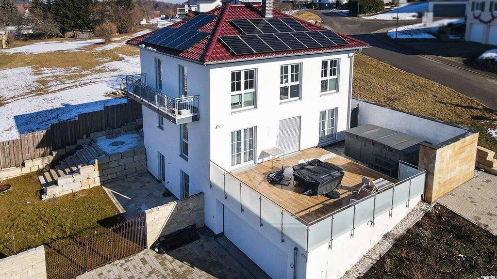 Diese luxuriöse Walmdachvilla wurde erst im Mai 2025 fertiggestellt und vereint höchste Baukunst mit edelsten Materialien und einer Ausstattung der absoluten Extraklasse. Von der ersten Minute an spüren Sie das ganz besondere Wohnambiente. Italienische Fliesen, edle Tapeten und elegante weiße Kassettentüren verleihen jedem Raum Stil und zeitlose Eleganz. Die großzügige Einbauküche mit Gaggenau-Geräten ist ein Meisterstück an Funktionalität und Ästhetik, hinter einer stilvollen Front verbirgt sich clever die Speisekammer und der Hauswirtschaftsraum, während ein gemütliches Fenster mit Sitzbank zum Verweilen und Genießen einlädt. Neben dem Gäste-Bad im Erdgeschoss setzt auch das Bad im Obergeschoss neue Maßstäbe. Die freistehende Badewanne wird zum privaten Wellnessbereich, während die insgesamt durchdachte Raumgestaltung sowohl Funktionalität als auch Eleganz bietet. Auch im Außenbereich beeindruckt die Villa durch exklusive Materialien wie weißen Juramarmor, italienischem Travertin und einem handgeschmiedeten Tor. Ein absolutes Highlight ist die über 40 m² große Dachterrasse mit herrlicher Aussicht und einem Jacuzzi, hier wird jeder Moment zu Ihrem ganz persönlichen Spa-Erlebnis. Technisch ist das Haus auf dem aller neusten Stand. Moderne Wärmepumpe, PV Anlage mit Speicher, Pollenfilter in der Lüftungsanlage ein Pluspunkt für Allergiker, Wasserenthärtungsanlage, dreifach verglaste Wärmedämmfenster, der behagliche Kaminofen und die angenehme Fußbodenheizung bieten höchsten Komfort bei minimalem Energieaufwand. Von fast allen Räumen eröffnet sich ein unvergleichlicher Blick auf die unberührte Natur der Schwäbischen Alb - ein Ort, an dem Ruhe, Exklusivität und Lebensqualität perfekt ineinandergreifen. Dieses Haus ist mehr als ein Zuhause. Es ist ein Statement, ein Lebensgefühl und ein Ort, den man gesehen haben muss, um die besondere Magie und Eleganz wirklich zu erleben.