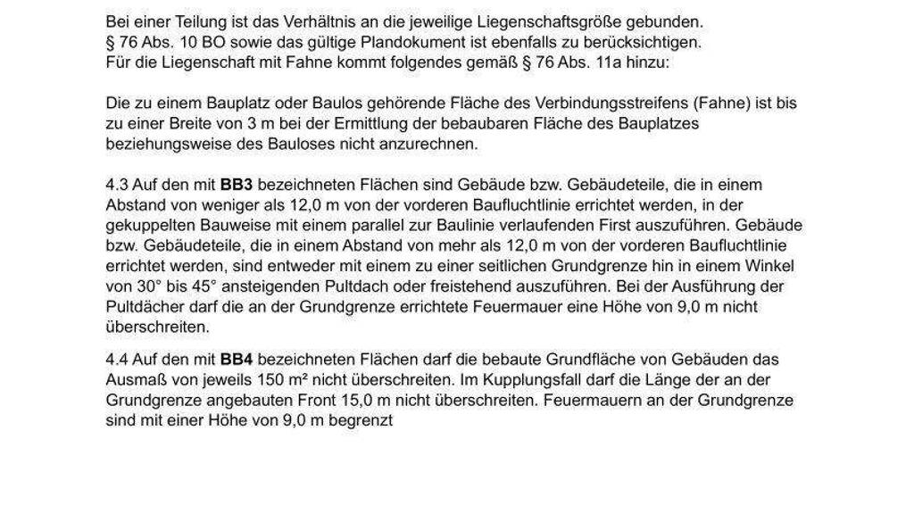 Die Liegenschaft darf grundsätzlich gemäß § 76 Abs. 10 BO zu 1/3 bebaut werden, dies unter Berücksichtigung des gültigen Plandokuments, insbesondere BB3 und BB4. Bei einer Teilung ist das Verhältnis an die jeweilige Liegenschaftsgröße gebunden. § 76 Abs. 10 BO sowie das gültige Plandokument ist ebenfalls zu berücksichtigen.