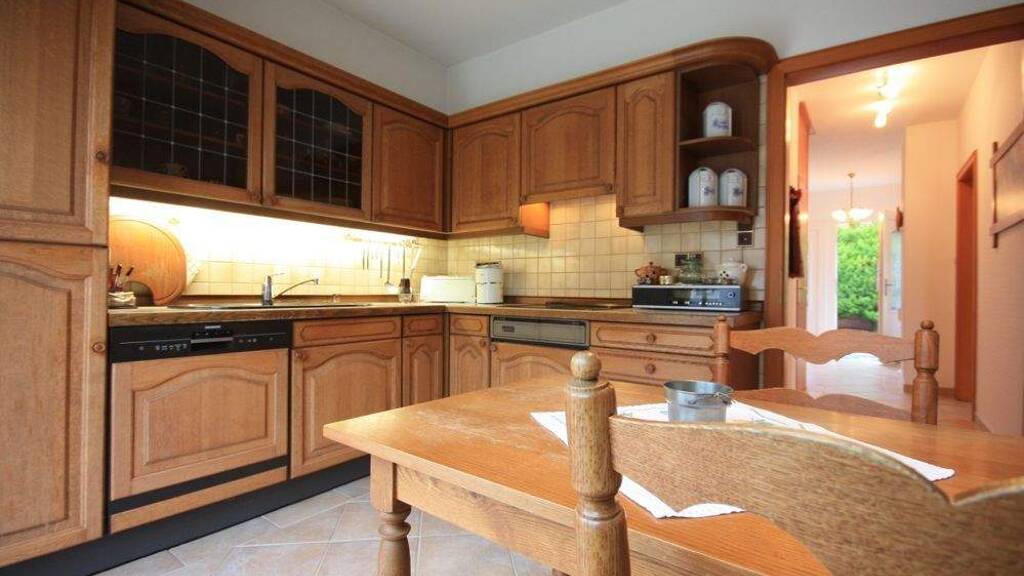 Im Erdgeschoss erwartet Sie ein großzügiger Wohn- und Essbereich, der durch seine offene Gestaltung ein helles und einladendes Ambiente schafft. Die separate Küche ist mit gepflegten Holzeinbauküche ausgestattet. Ein gut dimensionierter Hauswirtschaftsraum bietet wertvollen Stauraum und verfügt über einen direkten Zugang nach draußen, zur überdachten Terrasse, die zum Entspannen und Verweilen einlädt. Darüber hinaus verfügt das Haus über zwei weitere Terrassen, von denen eine mit einer ausfahrbaren Markise ausgestattet ist - ideal für sonnige Tage und flexible Nutzungsmöglichkeiten des Außenbereichs. Ein Gäste-WC komplettiert das Erdgeschoss.