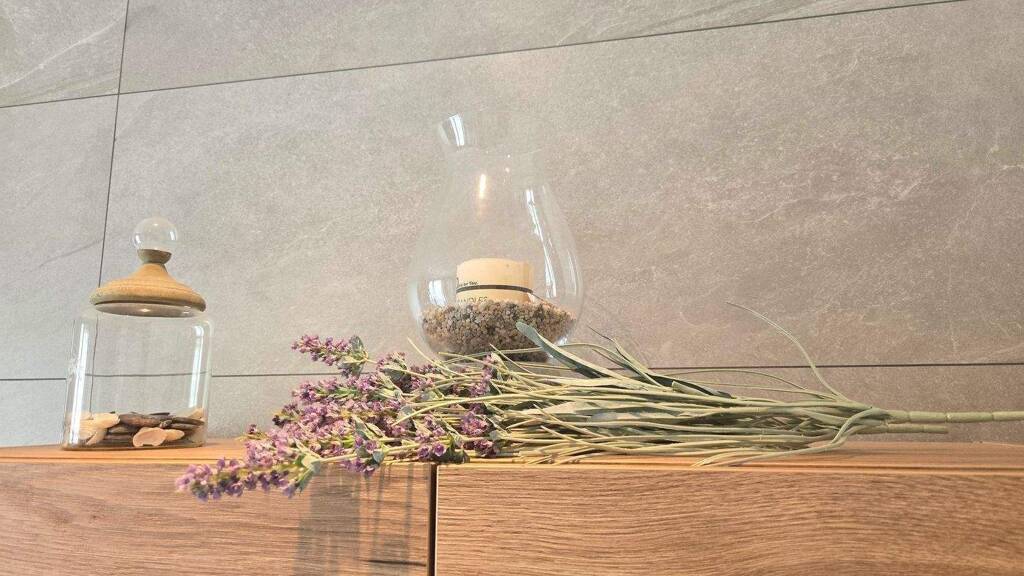 Bad mit Extras: bodengleiche Walk-in-Dusche, Unterputzarmaturen, großes Waschbecken, Badewanne