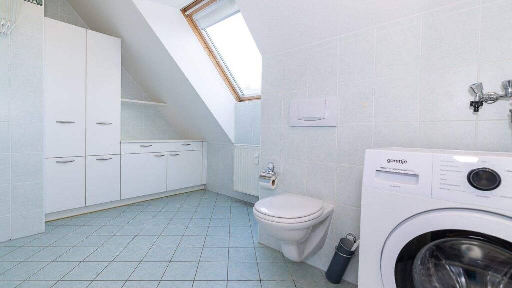 * groß geschnittenes Badezimmer mit Dusche, Fenster und zweitem WC