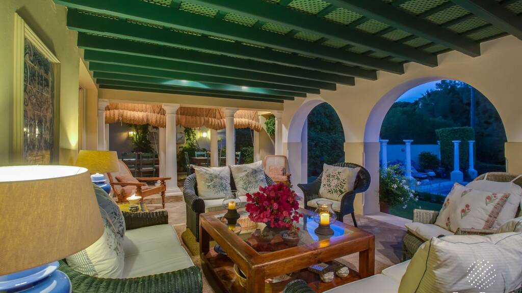 Durch eine große Tür in einer Außenwand betreten Sie das Anwesen mit einem Schlafzimmer auf der linken Seite. Es sind weitere zwei Terrassen: eine Gartenterrasse auf der rechten Seite und eine andere auf der linken Seite zum Sitzen mit einem Kamin. Die Gartenterrasse führt zu einer Suite mit 3 Schlafzimmern/Bädern und einem kleinen Wohnzimmer, außerdem haben alle Schlafzimmer Zugang zum Garten.